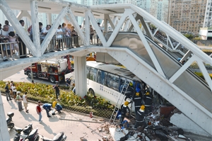 失事旅游巴最后撞向一处行人天桥底停下,司机被夹在形如废铁的车头内,消防员历40分钟将其救出送院,伤势严重,至10日晚仍在接受手术中,意外起因有待调查。
