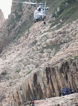 一名男子离奇倒毙在西贡石崖下,大批救援人员乘直升机到场调查,初步认为案件无可疑。(图片来源:明报)