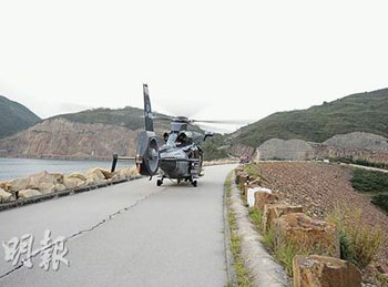 西贡万宜水库东坝发现男子尸体后,飞行服务队一度派出直升机到场协助救援。(图片来源:明报)