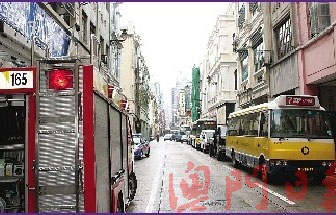 据现场消息称,19日上午10时左右,天雨绵绵,路面湿漉漉,MF77-××号来往澳门和氹仔的33号新福利大巴载着约30名乘客,由火船头街转入新马路,驶至近诚兴银行时,突有一名男途人由海边新街冲出马路,巴士司机潜意识紧急剎车,以免撞及途人酿成严重意外。但疑因天雨路滑,巴士失控冲前,左边车头狂撼对面行人路石柱,才令大巴停下。