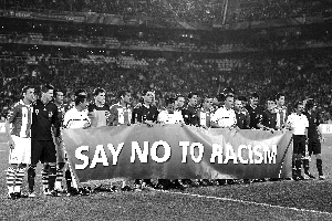 当地时间7月3日,南非约翰内斯堡,在西班牙队对阵巴拉圭队的淘汰赛前,双方球员在“对种族主义说不”的宣传牌前合影。