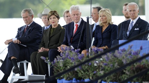 今年9月10日,美国前总统小布什与现任副总统拜登为尚克斯维尔坠机现场的纪念碑揭幕,遇难者家属们见证了这一过程。