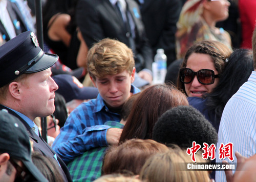 中新网纽约9月11日电 (记者 李洋)纽约世贸遗址于美东时间11日上午举行悲怆的默哀仪式,悼念“9·11”恐怖袭击事件十周年。美国总统奥巴马夫妇和前总统小布什夫妇,以及美国国务卿希拉里等出席仪式。
