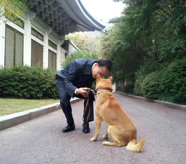 青杜尔是珍岛犬,过去一直生活在青瓦台,2月份同结束任期的李明博夫妇共同离开青瓦台,搬到了论岘洞。