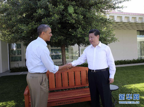 会晤开始前,习近平和奥巴马在庄园中散步,在轻松的气氛中进行交流。奥巴马将一把加利福尼亚州红衫木制作的长椅赠送给习近平。红杉树是加州名贵树种。1972年美国前总统尼克松访华时,将几株加州红杉树苗作为礼物赠送给中方。此后,加州红杉树已在中国一些省市成功引种,成为中美友谊的象征。