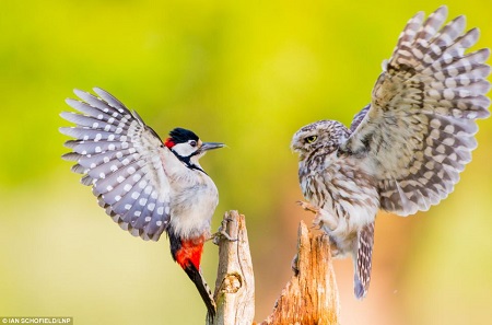 据报道,斯科菲尔德在随一个观察摄影团前往自然保护区拍摄时遇到了这一幕。为了保护幼鸟,小猫头鹰和啄木鸟“大打出爪”。两只鸟的打斗过程发生的非常迅速,但眼疾手快的斯科菲尔德还是用相机记录下一场景。