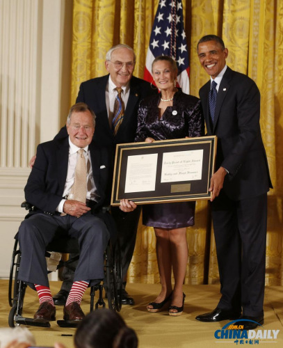 7月15日颁发的正好是第5000个奖项,现年89岁的老布什特意坐着轮椅出席仪式。奥巴马称赞他让美国成为一个更友善的国家。老布什简短回应,感谢奥巴马的热情招待。