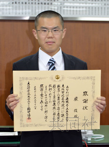 9月18日上午,勇救溺水男童的中国留学生严俊(右)接受大阪警方送上的感谢信。(共同社)