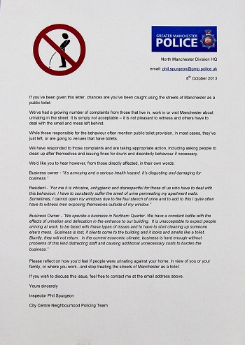 报道称,当街小便人见人憎,曼彻斯特警方为杜绝此况,要求在公众地方小便的民众,用警员提供的工具清洁地面;若拒绝可选择罚款了事。有议员表示欢迎,认为要由商户或居民打扫清洁,既不卫生也不公平。