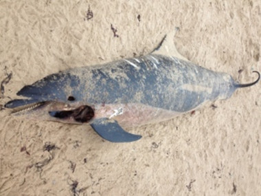一头死去的海豚遗留在海滩上,无人清理。