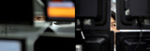 左边图片摄于2013年4月8日,日本东京一家外汇公司雇员正看着显示器。右边图片摄于2013年6月20日,韩国首尔一家外汇公司正看着显示器。
