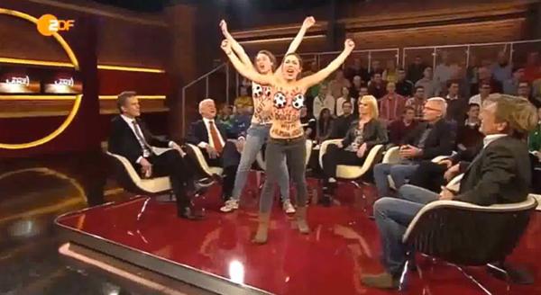 据德国《明镜周刊》12月12日报道,两名乌克兰女权组织(Femen)成员日前冲入德国著名主持人兰茨(Markus Lanz)的脱口秀节目。她们赤裸上身抗议2022年世界杯主办国卡塔尔的现状。面对这一突发事件,主持人却显得应对自如。