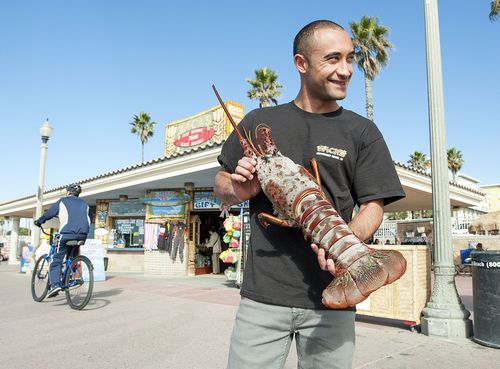 在加州亨廷顿海滩码头附近海域,阿里潜水到大约4米深的地方时,突然看到一只巨型龙虾。