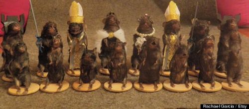 此款西洋棋的老鼠们同样有黑白大军,各自有各自的配备,像是国王带着王冠、城堡、骑士则有盾牌和刀剑等装备,王后则有后冠、主教穿着圣袍。对此,瑞秋表示,将这些老鼠制成标本总比它们沦为爬虫类的大餐好。