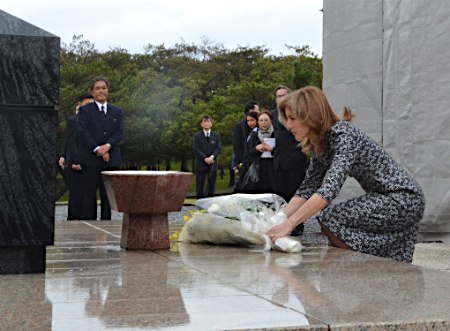 这是卡罗琳上任后第一次访问冲绳。为纪念太平洋战争、在日本国内唯一的登陆战中牺牲的战死者,卡罗琳参观了糸满市的和平祈念公园。