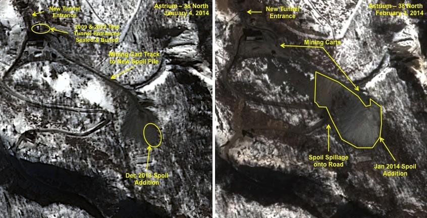 该研究所称,他们将最新观测到的卫星图像与2013年12月的观测结果对比,发现在一个月左右的时间里,丰溪里核试场挖掘新隧道的残骸多了近一倍。