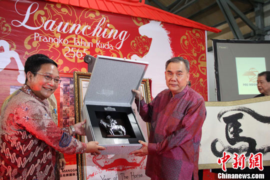 中新社雅加达2月25日电 (记者 顾时宏)为庆祝中国农历马年,印尼邮政局和印尼-中国经济、社会与文化合作协会25日在雅加达集邮大厦联合举行马年生肖邮票发行仪式。