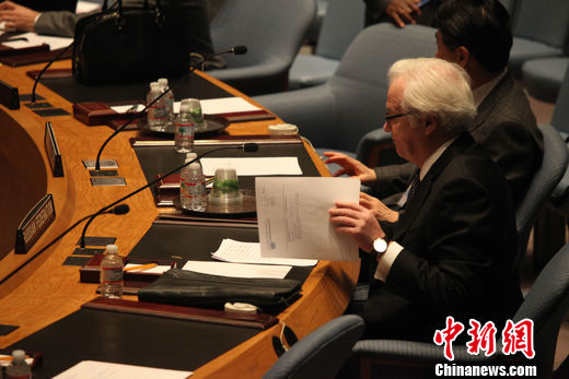 当地时间3月15日,联合国安理会就美国起草的、有关反对克里米亚公投的决议草案举行投票表决,由于俄罗斯投票否决,决议草案未通过。当天投票结果为13票赞成、1票否决、1票弃权。图为俄罗斯常驻联合国代表丘尔金阐述俄方立场。中新网发 李洋摄