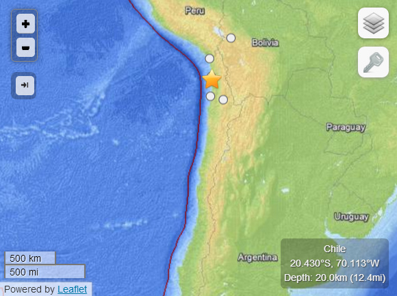 在稍早的北京时间9时58分,智利海域已发生一次6.4级地震,震源深度10公里,震中距伊基克市47公里。