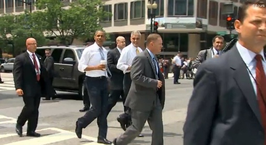 奥巴马在保安环绕下漫步街头,显得相当惬意