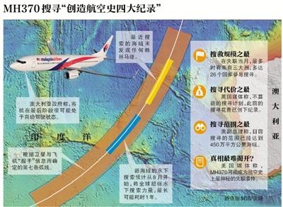 不仅花费创纪录,澳大利亚副总理沃伦·特拉斯26日说,搜寻MH370已遍及450万平方公里海域,这是“历史上范围最大的搜寻行动”。