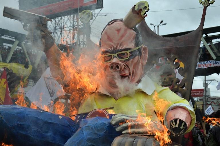 “情绪化”的阿基诺成为菲媒关注的热点。《菲律宾每日问询者报》称,在演讲快结束时,阿基诺三世回忆起父母,看似快要掉下眼泪。他的父亲阿基诺二世1983年结束流亡,从美国回到菲律宾,在下飞机时遭刺杀身亡。这次刺杀引发菲律宾的反政府示威,并在1986年推翻前独裁者马科斯,由阿基诺二世的遗孀出任总统。他沙哑着声音说:“老板们(指那些在2010年投票支持他当总统的菲律宾选民),你们给我引领这个国家转型的机会,如果我对这个呼声置之不理,就像是对我的父母置之不理。你们一直忠于我,我也一直对你们很忠诚。”他在演讲结束时说:“我们将继续证明,菲律宾人值得为之献身、为之活着、为之奋斗。”在阿基诺三世演讲时,电视画面显示他在贵宾席上的妹妹不停擦眼泪,两个姐姐眼圈也红了。不过,场内的动情并未化解民众对他的不满。在阿基诺三世发表演讲前,一万多名菲律宾示威者发动游行,人们聚集在国会附近的大街上,抗议阿基诺任内出现的多起贪腐丑闻,并焚烧象征阿基诺三世的假人(如图),要求其下台。示威者在试图冲击警方设置的防线时,遭警方用高压水枪喷射,在僵持大约半小时后,示威者被驱离。《菲律宾星报》称,阿基诺刚开始演讲后不久,左派议员集体离场,并加入游行队伍。