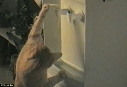 一段记录的视频显示,起初桃子只是坐在饮水机下面蓄势待发,之后它用后肢支撑着身体,前爪则使劲扳下出水开关,然后迅速的喝了几口从机中流出的水,看起来十分成熟老练。