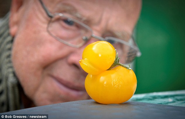 这两个一红一黄的西红柿酷似大黄鸭,由当地退休货车司机沃尔培植。沃尔热爱园艺,在家中后园建温室种植。