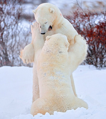 当时,一头北极熊游荡进入另一头北极熊领地中,双方立刻爆发大战。这两头北极熊利用熊爪猛击对方,并且互相推搡,试图获取优势。当季先科看到眼前一幕时,他几乎无法相信。随后10分钟里,季先科观看了两头体重超过500公斤的北极熊在阳光下大战的场景。
