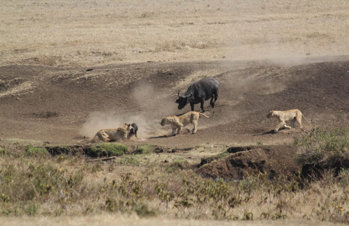 据英国《每日邮报》12月30日报道,德国摄影师安德里亚斯·汉茨切尔在非洲东部的坦桑尼亚旅行时,拍到惊人一幕,一头母水牛为了保护幼犊,勇敢地与3只饥饿狮子搏斗,并最终获胜。
