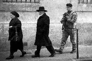 1月12日,在法国巴黎,法国士兵在一所犹太学校附近巡逻。新华社发
