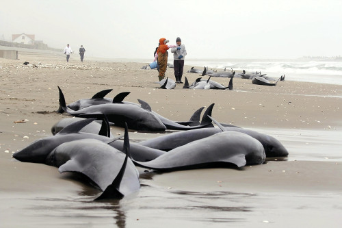 日本茨城海岸现百余搁浅海豚 民众洒水施救(图)