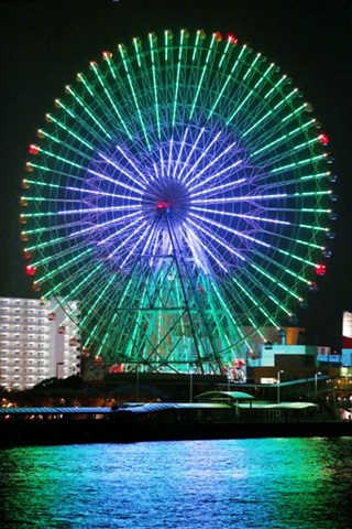 当地介绍称,LED照明的直接光和间接光组合的手法作用于摩天轮,尚属全世界首创。通过这样的手法,摩天轮可映照出多种复杂的图案。