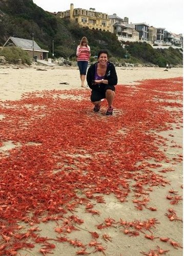 报道指出,这些外形很像小龙虾的红色迷你蟹还是活的,它们随着海浪冲上海滩,一旦上岸就无处可去,也无力游回大海,绝大多数最后死在沙滩上。这些迷你红蟹在海中游动时像乌贼,在海滩上又像螃蟹。