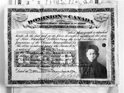 在参与铁路修筑的1.57万名华工中,4000人客死异乡。华工为加拿大做出的卓著贡献是加国版图完整的起因,却也成为一代华人的噩梦:一部对华人带有明显歧视色彩的税法——“人头税”出台。通过《华人入境条例》颁布,加政府规定华人新移民额外缴纳50加元。