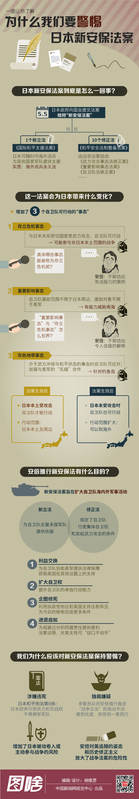 近日,日本首相安倍强推“新安保法案”动作不断。为什么外交部强硬表态,学者专家忧心忡忡,日本国内抗议不断?新安保法案对周边局势到底有什么影响,为什么我们应该警惕,一张图帮你找到答案。