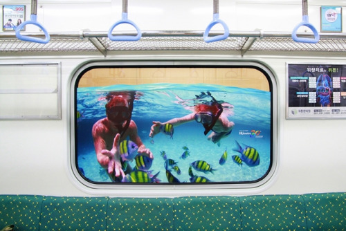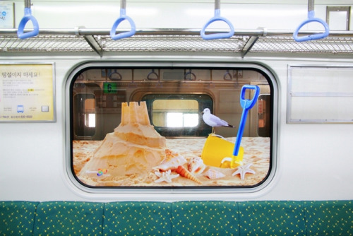 韩国釜山交通公社表示,为了给夏季前往釜山的游客带来快乐,特别将釜山大海的形象搬上城市铁路,构成“海滩地铁”。