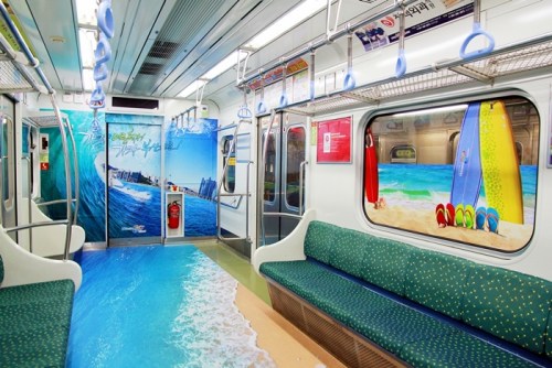 釜山交通公社在经过海云台等釜山著名海岸景点的二号线2列电车上布置了“海滩地铁”,为乘客带来清凉一夏。(图片来源:釜山交通公社)
