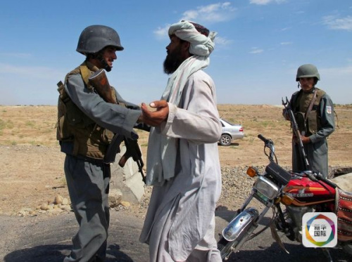 阿富汗警察对一名骑车人进行搜查。(图片来源:新华/法新)