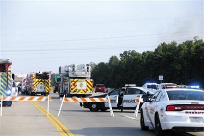 多辆消防车赶往现场,警车封路。