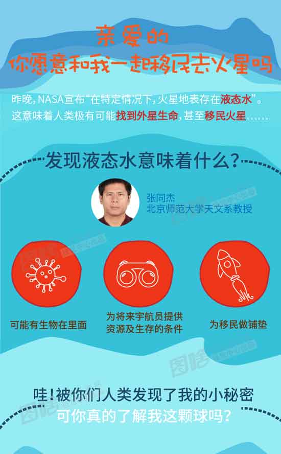 参与互动 当地时间9月28日,NASA宣布“在某些特定情况下,火星地表存在液态水”。这意味着我们极有可能寻找到外星生命,甚至将人类移民火星……
