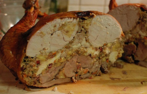 美国人做火鸡,烹调方法基本上万变不离其宗,那就是烤。不过,烤火鸡的吃法也演变出了不少花样,其中一种比较奇葩的吃法,叫做“火鸭鸡”(Turducken)。