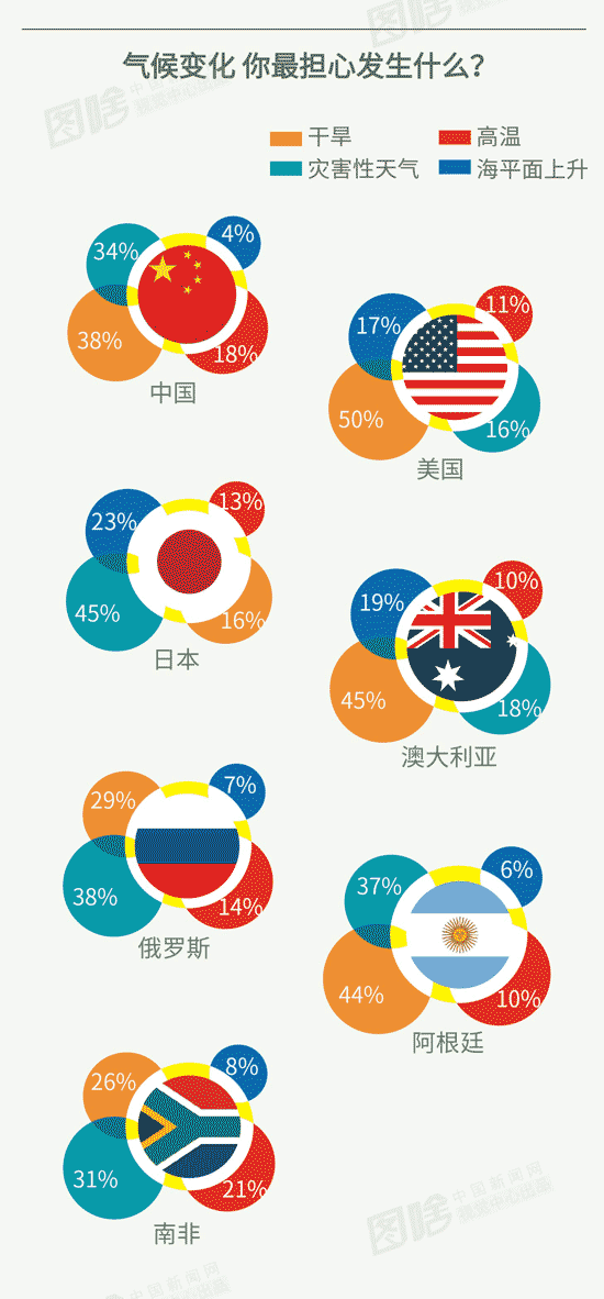 从全球范围来看,干旱是人们最担心的问题,有44%的人担心气候变化会导致干旱区域更广阔或干旱年份更频繁出现,另外有25%的人会担心灾害性天气(如:洪水、强风暴等)更频繁,有14%的人担心地球会有经受更多高温天气,有6%的人担心海平面上升。