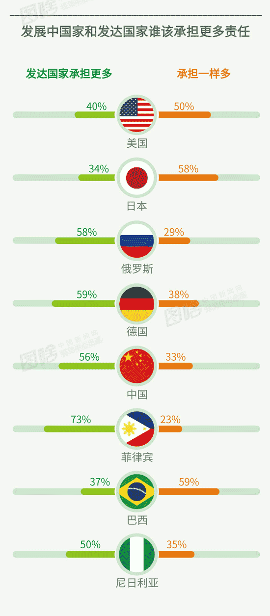 在大多数国家(54%)看来,解决气候问题的责任应该由发达国家负担更多,因为这些国家早些年排放了许多温室气体;也有一部分国家(38%),如美国、日本等,认为发展中国家和发达国家应该承担相同的责任。