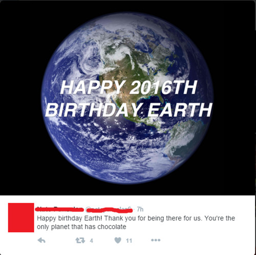 报道称,有美国网友认为公历纪元是以地球诞生之年开始计算的。有一位名为本的用户,在新年来临之际,竟然在社交网站上发表感言称:“地球,祝你2016岁生日快乐!感谢你的存在,而且你是唯一有巧克力存在的星球。”