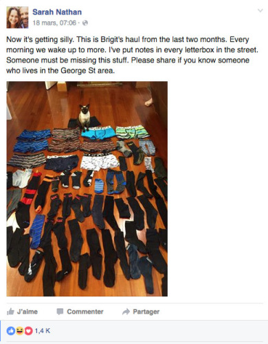 近日,为了找回失主,萨拉在社交网站上发布了布里吉特所有“战利品”的照片,希望能有人前来认领。