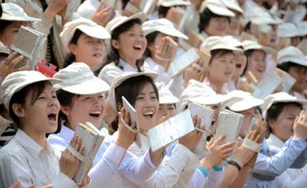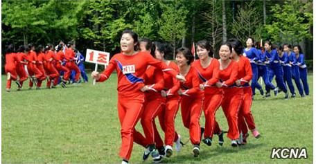 下图为朝鲜劳动者为参加劳动节比赛的选手加油助威。