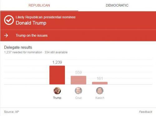 美联社报道称,特朗普现在已经获得1239名代表支持,比所需人数多出两人。特朗普26日表示,自己得到了党内“几乎所有人”的支持。现在只要等到共和党在7月份召开党代会,并在党代会上正式认可特朗普作为本党总统候选人,那么他就将代表共和党和民主党总统候选人竞争。