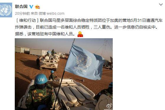 另据联合国官微消息,联合国马里多层面综合稳定特派团位于加奥的营地5月31日遭遇汽车炸弹袭击,目前已造成1名维和人员牺牲,3人重伤。进一步信息仍自核实中。据悉,该营地驻有中国维和人员。
