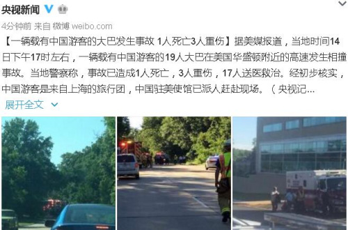 参与互动 美一载有中国游客的大巴发生事故 致1名中国女性死亡 来源:央视新闻